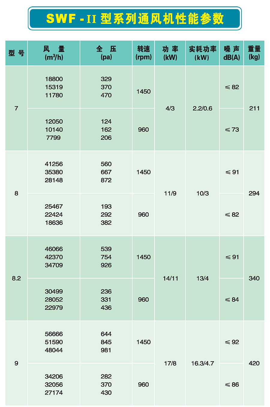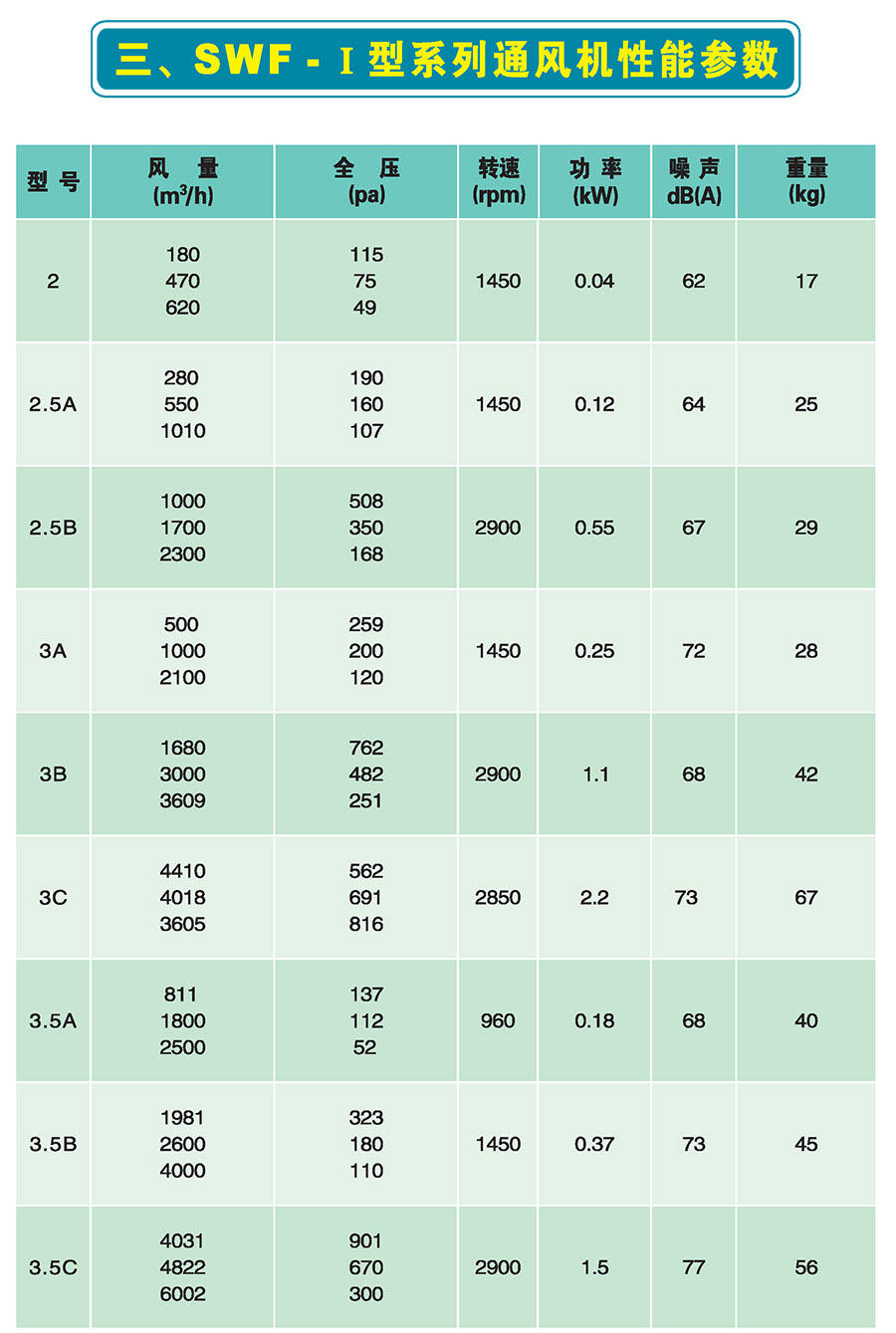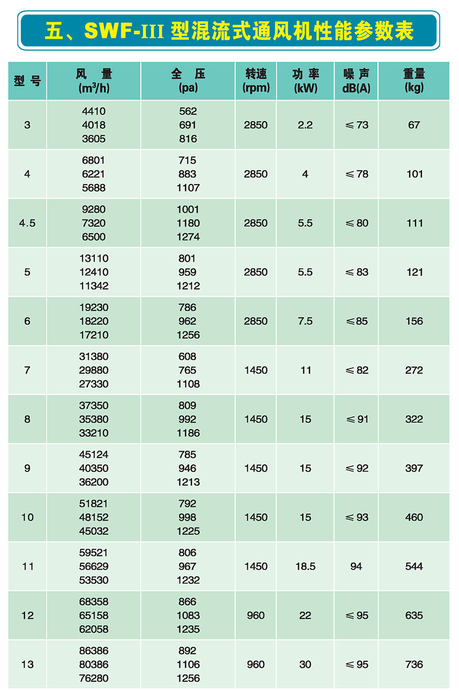 本系列風(fēng)機分SWF-l、SWF-ll和SWF-lll三種型號,SWF-l型可取代高壓軸流風(fēng)機;SWF-ll型為雙速,可以一機兩用;SWF-lll其壓力較高,可替代中低壓離心風(fēng)機。亦可根據(jù)用戶要求制作消音型混流風(fēng)機。