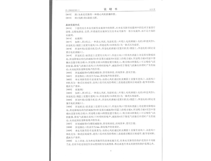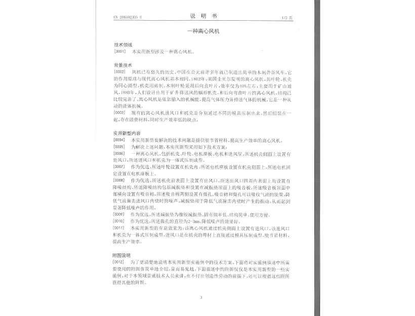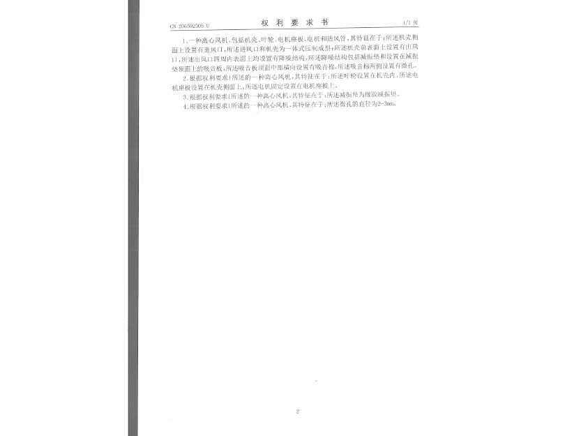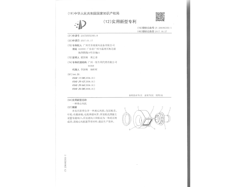 實(shí)用新型專利證書(shū) 一種離心風(fēng)機(jī)